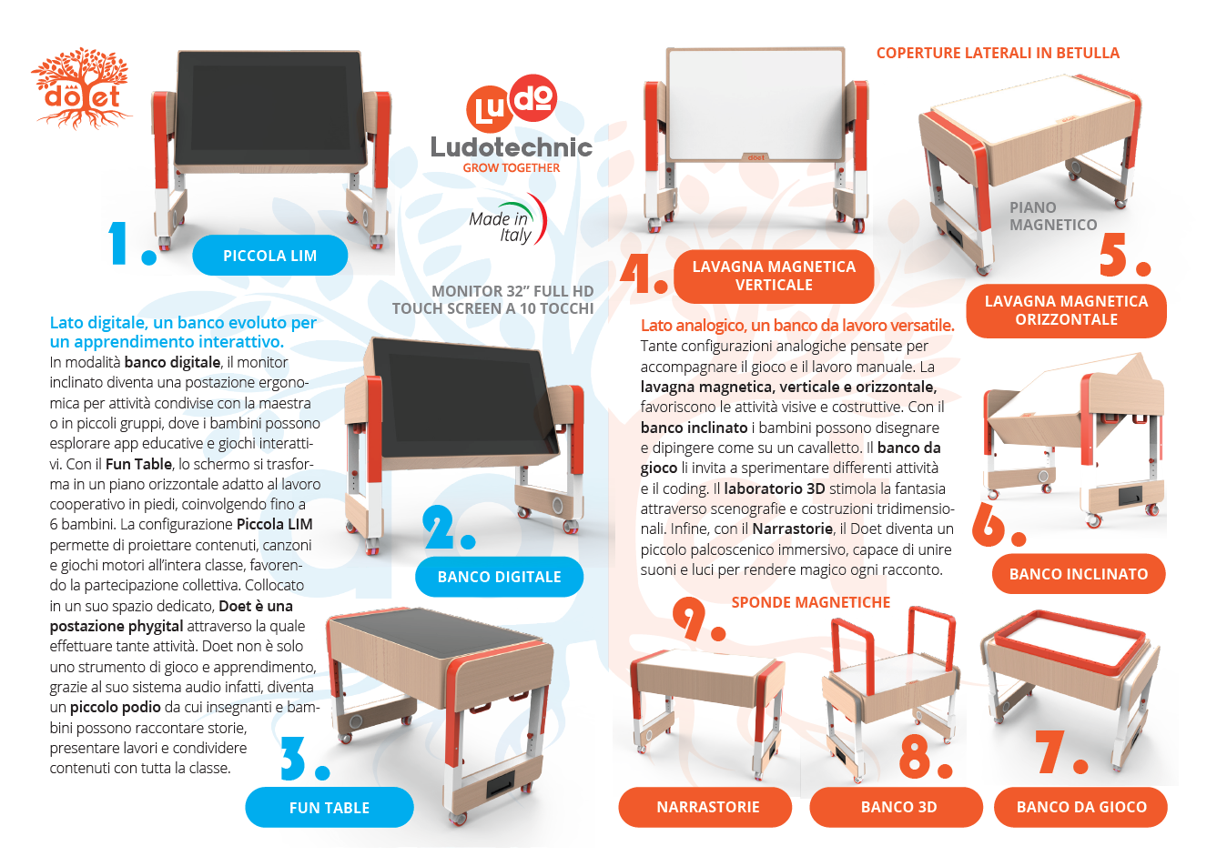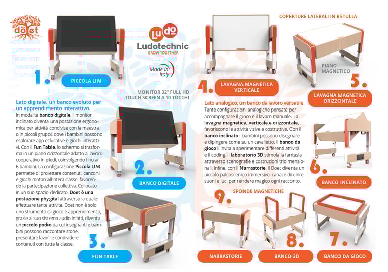 Doet è un banco didattico innovativo che unisce il meglio del mondo digitale e analogico, offrendo un'esperienza di apprendimento completa e stimolante per i bambini dai 3 ai 6 anni. Con il suo design ergonomico e le sue funzionalità interattive, il Doet aiuta i bambini a sviluppare le loro abilità motorie, cognitive e sociali, mentre si divertono e imparano.