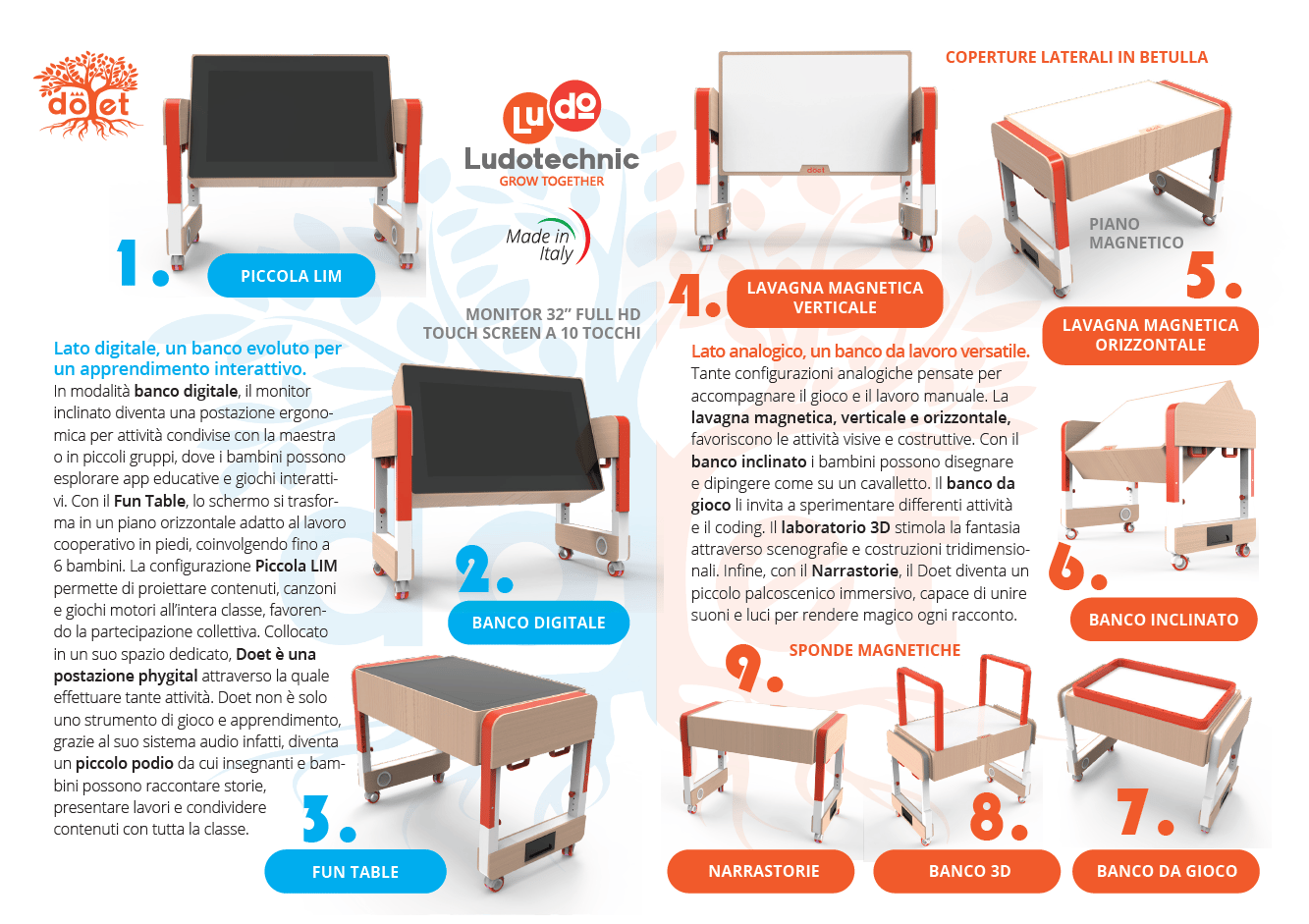 Doet è un banco didattico innovativo che unisce il meglio del mondo digitale e analogico, offrendo un'esperienza di apprendimento completa e stimolante per i bambini dai 3 agli 8 anni. Con il suo design ergonomico e le sue funzionalità interattive, il Doet aiuta i bambini a sviluppare le loro abilità motorie, cognitive e sociali, mentre si divertono e imparano.