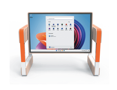Doet is a desk for early childhood and preschool education featuring a reversible work surface that can rotate 180°. On one side, it’s a traditional wooden desk; on the other, a digital learning station with a 32" capacitive multi-touch screen and a built-in Windows PC system, fully integrated into the structure of the desk.