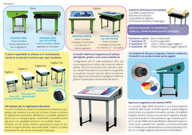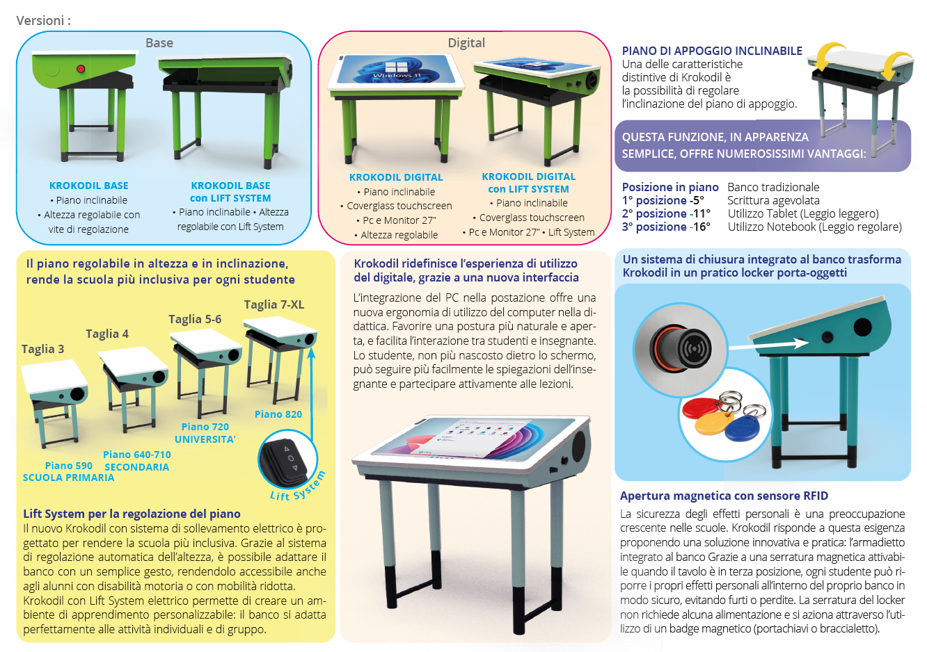 Krokodil è il banco del futuro, pronto ad affrontare le sfide della didattica ibrida. Grazie alla sua versatilità, si adatta perfettamente a qualsiasi modalità di apprendimento, di tipo tradizionale o digitale. Con Krokodil l'aula si trasforma in uno spazio dinamico e flessibile, dove gli studenti possono lavorare individualmente, in gruppo o in modalità assistita. Il suo schermo touch interattivo e la configurazione personalizzabile lo rendono lo strumento ideale per stimolare la creatività e l'autonomia degli studenti.